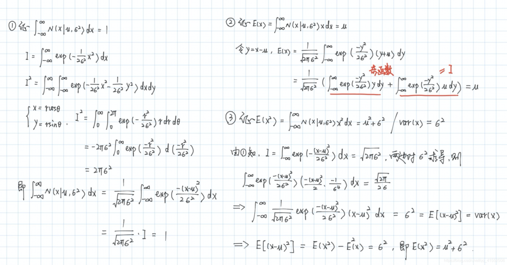 $\mathbb{E}[x]=\int_{-\infty}^{\infty} \mathcal{N}\left(x \mid \mu, \sigma^{2}\right) x \mathrm{~d} x=\mu$