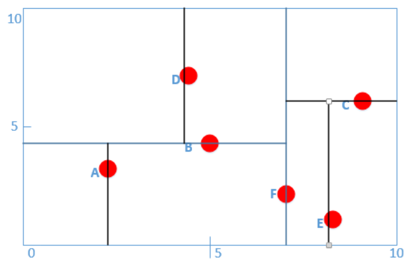 在上述过程中,「寻找最近的 $k$ 个点」成为主要难点,最常用的方式是基于 kd 树,对平面进行划分,由此高效地定位预测点在平面中的位置,实现高效查询。