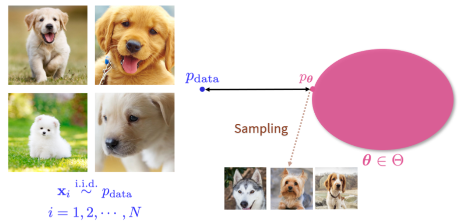 Diffusion Models 功能:一个生成器,通过对一堆已有图片进行学习,使其可以源源不断生成大量的新图片,即通过 $p_{\text{data}}$ 学习 $p_\theta$,再用 $p_\theta$ 不断生成新图片。