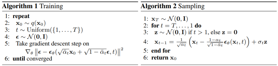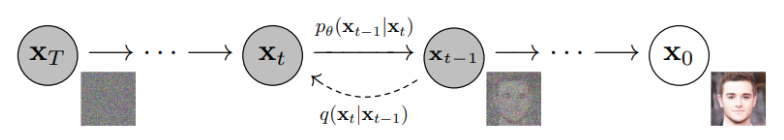 逆向过程,需要采用极大似然估计的方式,使用网络估计前向过程加随机噪声的方式,训练得到一个能估计每一步如何加噪声的网络,由此实现将 $\mathbf{x}_T$ 逆向还原为 $\mathbf{x}_0$ 的过程。