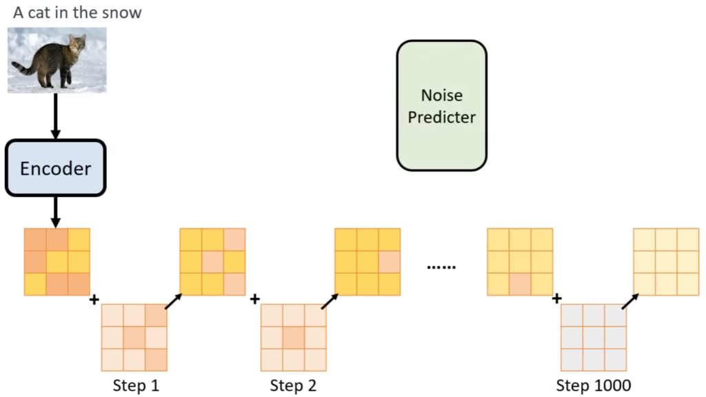 随后训练一个 Noise Predictor,输入为「第 x 步 + 第 x 步对应的加噪结果 + Text Embedding」,输出为第 x 步所加的噪声。