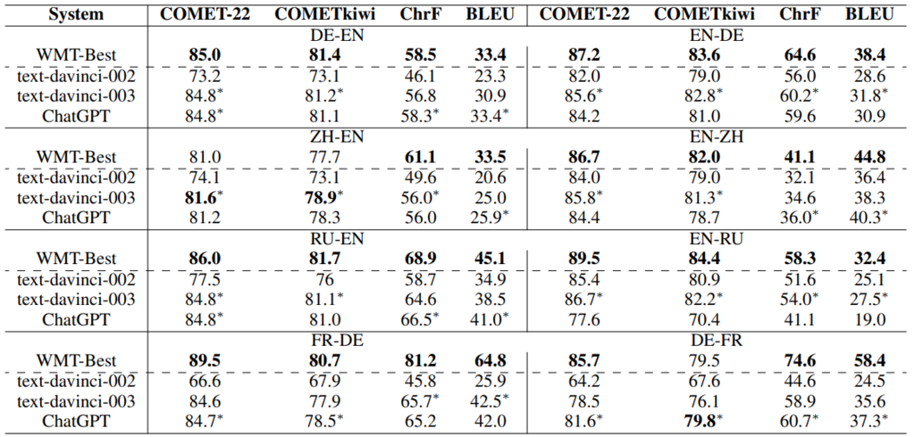 专才在单一任务上有机会赢过通才。例如在下述论文中,在各类任务上(数值越大越好),ChatGPT 表现都不错,但依然没办法赢过专才。