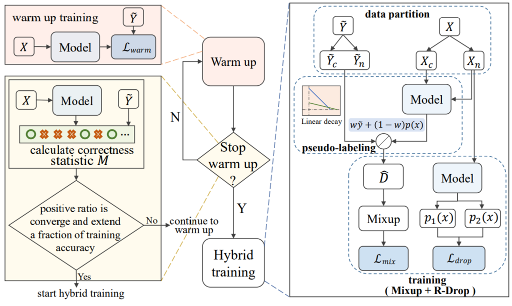 Data Denoise [Cheng et al., EMNLP’23]:其假设在训练过程中,噪声数据更难学且噪声数据的预测标签更不稳定;基于此,其通过 warm-up 的训练将目标数据分为了 clean data 和 noisy data,并给其打上了新的 pseudo-label;最后,其通过 mix up 的方式再次训练整个模型,即对使用 PTM 得到的 embedding 数据进行线性组合,构造了新的训练数据。