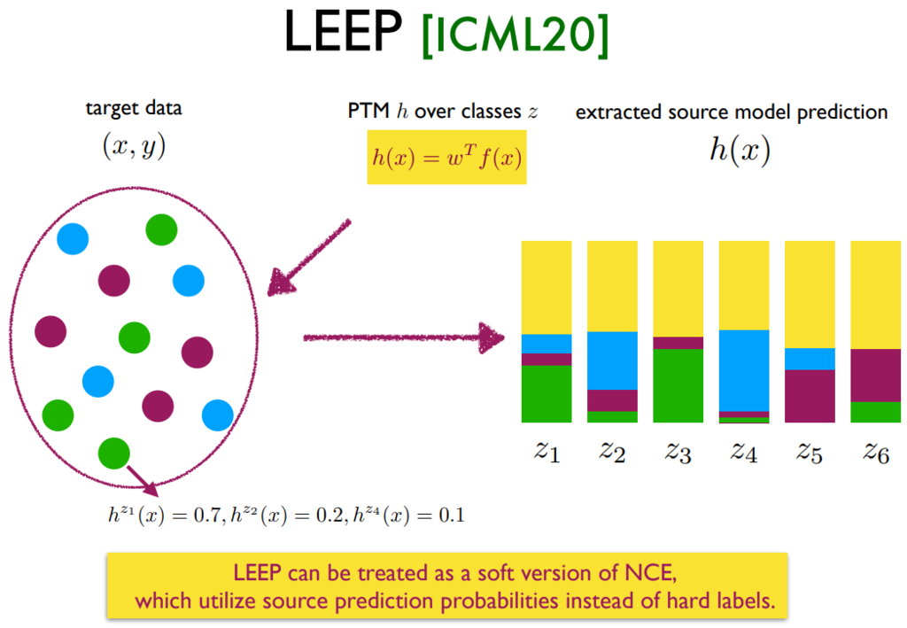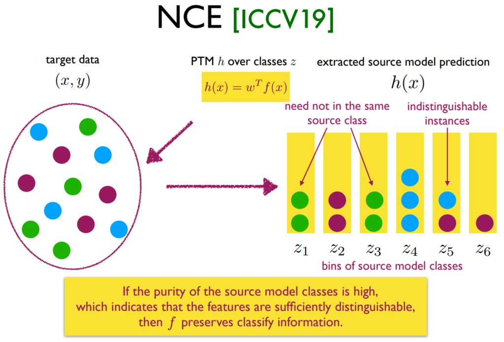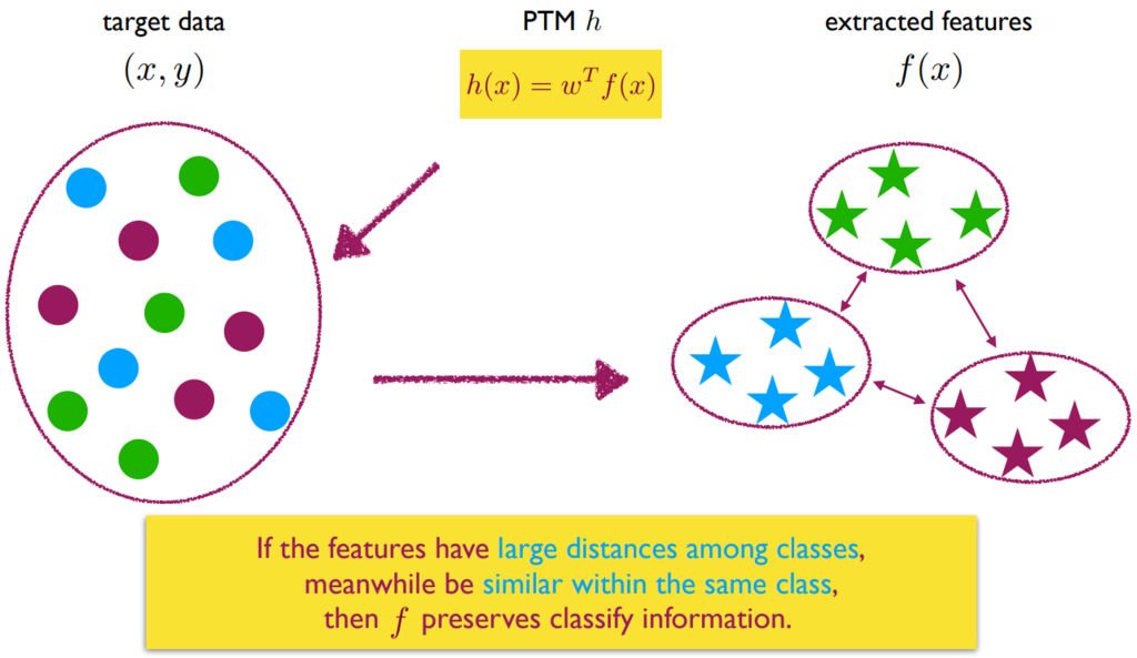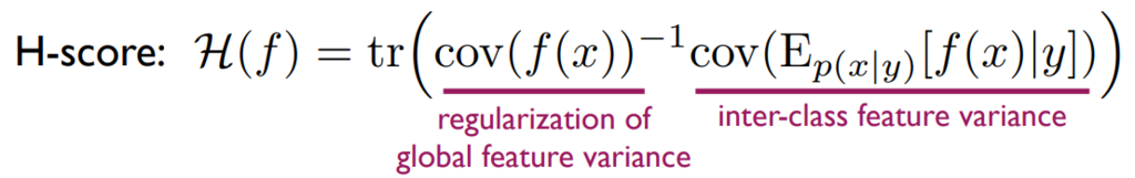 H-Score [Bao et al., ICIA’19]: 判断不同类别的数据特征(通过 PTM 提取得到),是否可以明显分开且类内比较近: