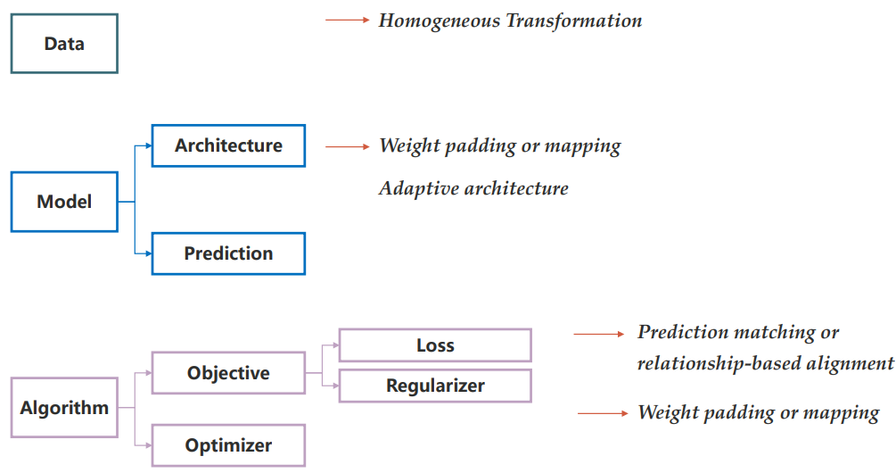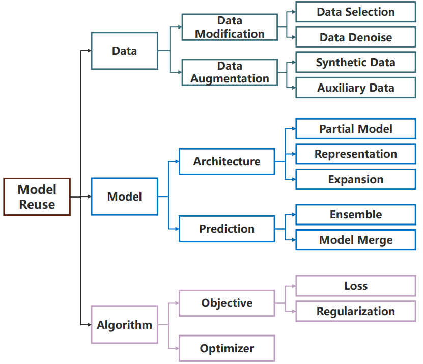 模型复用可以从多个角度进行分类:(1)同构模型复用和异构模型复用;(2)单模型复用和多模型复用;(3)从 data-level、model-level 和 algorithm-level 进行模型复用。