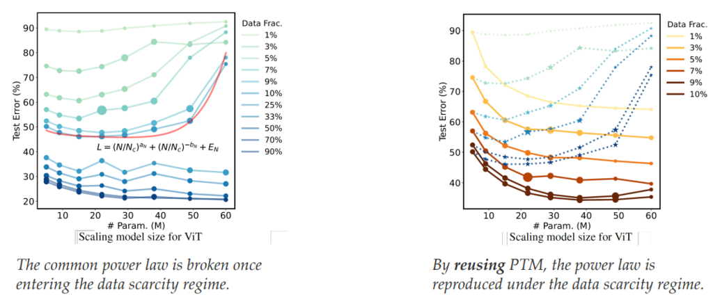 Tutorial 中指出在一些数据量比较稀少的场景,neural scaling law (the performance, training data, and model size generally should follow a power law) 不一定成立,但复用 PTM 依然能复现出所期待的曲线 [Wang et al., ICML’23]: