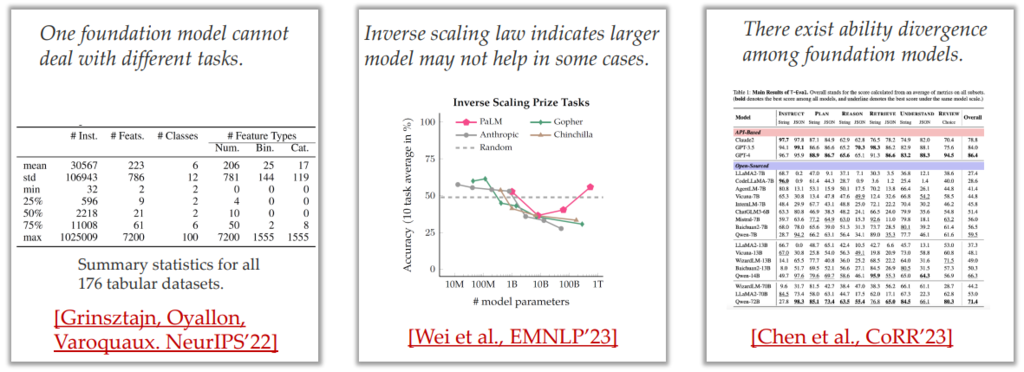 例如在表格场景中,无法使用一个模型解决各种各样的任务 [Grinsztajn et al., NeurIPS’22]
