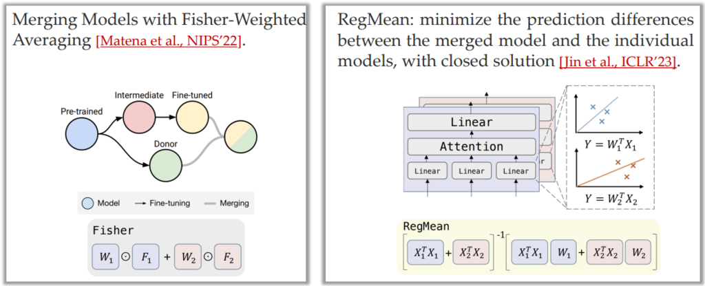 Model merge: Average the weight of two homogeneous models [Singh and Jaggi et al., NIPS’20].