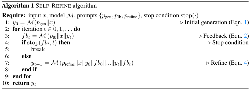 整体的算法如下所示(只需要提供生成回答 $p_{\text{gen}}$、提供反馈 $p_{\text{fb}}$、改进回答 $p_{\text{refine}}$ 的 Prompt,再不断迭代即可):