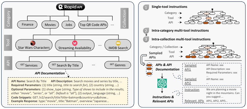 随后基于这些指令,可以通过监督学习 (Supervised Fine-tuning, SFT) 在 LLaMA 的基础上得到 ToolLLaMA;再基于 API 的文档,训练一个 API Retriever,用于后续判断指令与哪些 API 比较相关。